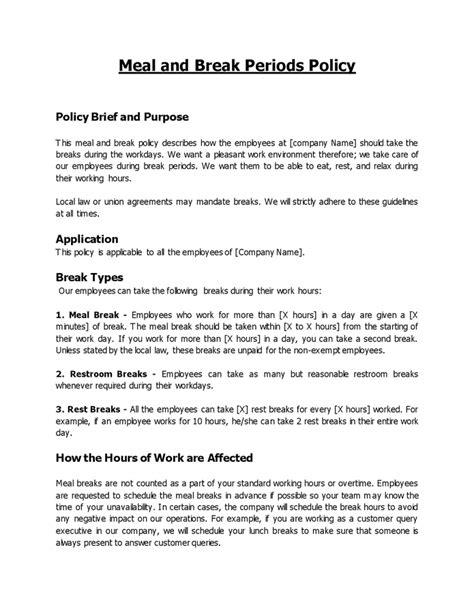 Meal Break Policy Template. Study on in learn more on how to. Web a lunch break policy will provide clear guidance to workers on the company’s stance on meal and rest.